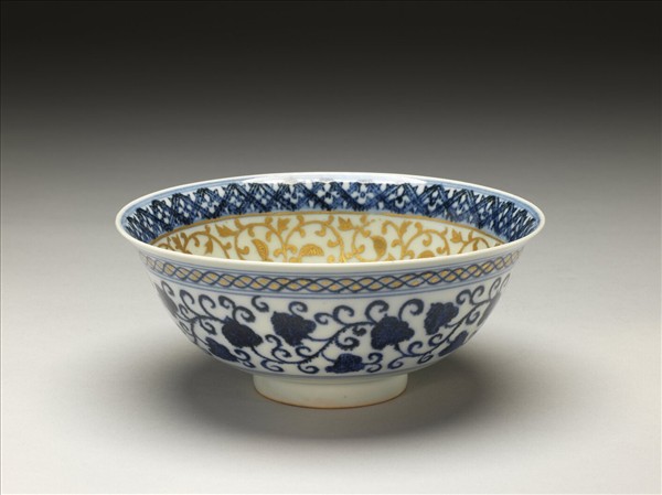 金彩碗的碗形及裝飾技法都是永樂時期的獨創。碗的口部外撇、深弧壁、矮圈足,胎體較輕。器身以青花加上金彩作為裝飾,青與金相襯,華麗且搶眼。碗的內口沿下以青花畫斜方格紋一周,碗心一圈錦紋圖案,內有一幅蓮塘景致。最特別的是在內壁以金彩做出纏枝花葉紋飾。器外壁口沿下以青花畫小方格圖案,方格內貼金,外壁畫纏枝花卉紋飾,花卉描繪邊框後,以細小網格畫成。器外底圈足內並有金彩雪花款識。相同器型裝飾布局的作品,也有以青花繪雪花款識者。另外,有全器以青花繪製紋樣不帶金彩的作品,全器青花為飾者,尚有帶有宣德年款及不帶款識兩種。景德鎮珠山遺址曾出土有白瓷金彩花卉紋斂口缽、白瓷金彩盤等加飾金彩的作品,但不見傳世品,更顯得青花加金彩器的難得可貴。