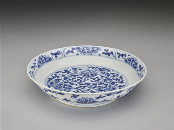 侈口窄唇,淺壁,矮圈足。胎質較薄,外壁畫盛開及待開之纏枝番蓮共十二朵,盤心雙圈青線內則繪綻放之番蓮三朵與未綻番蓮七朵,內面口沿飾番蓮紋一周。底有「大清乾隆年製」二行六字篆款。