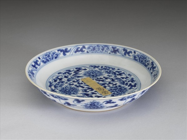 侈口窄唇,淺壁,矮圈足。胎質較薄,外壁畫盛開及待開之纏枝番蓮共十二朵,盤心雙圈青線內則繪綻放之番蓮三朵與未綻番蓮七朵,內面口沿飾番蓮紋一周。底有「大清乾隆年製」二行六字篆款。