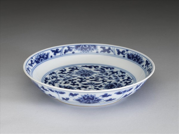 侈口窄唇,淺壁,矮圈足。胎質較薄,外壁畫盛開及待開之纏枝番蓮共十二朵,盤心雙圈青線內則繪綻放之番蓮三朵與未綻番蓮七朵,內面口沿飾番蓮紋一周。底有「大清乾隆年製」二行六字篆款。