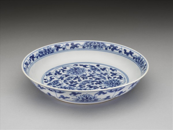 侈口窄唇,淺壁,矮圈足。胎質較薄,外壁畫盛開及待開之纏枝番蓮共十二朵,盤心雙圈青線內則繪綻放之番蓮三朵與未綻番蓮七朵,內面口沿飾番蓮紋一周。底有「大清乾隆年製」二行六字篆款。