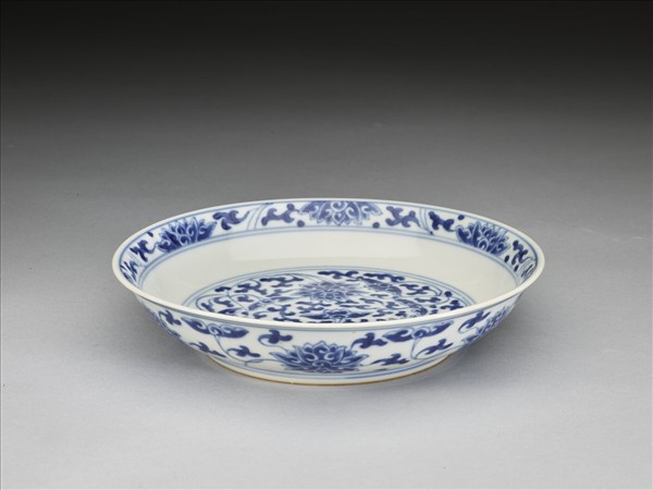 侈口窄唇,淺壁,矮圈足。胎質較薄,外壁畫盛開及待開之纏枝番蓮共十二朵,盤心雙圈青線內則繪綻放之番蓮三朵與未綻番蓮七朵,內面口沿飾番蓮紋一周。底有「大清乾隆年製」二行六字篆款。