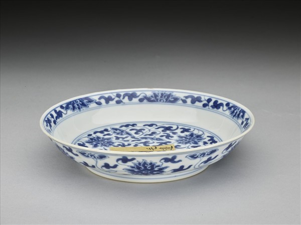 侈口窄唇,淺壁,矮圈足。胎質較薄,外壁畫盛開及待開之纏枝番蓮共十二朵,盤心雙圈青線內則繪綻放之番蓮三朵與未綻番蓮七朵,內面口沿飾番蓮紋一周。底有「大清乾隆年製」二行六字篆款。