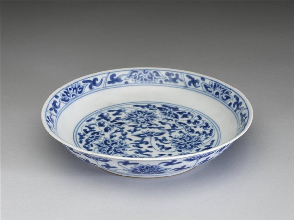 侈口窄唇,淺壁,矮圈足。胎質較薄,外壁畫盛開及待開之纏枝番蓮共十二朵,盤心雙圈青線內則繪綻放之番蓮三朵與未綻番蓮七朵,內面口沿飾番蓮紋一周。底有「大清乾隆年製」二行六字篆款。