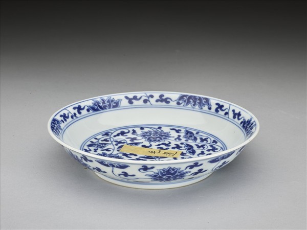 侈口窄唇,淺壁,矮圈足。胎質較薄,外壁畫盛開及待開之纏枝番蓮共十二朵,盤心雙圈青線內則繪綻放之番蓮三朵與未綻番蓮七朵,內面口沿飾番蓮紋一周。底有「大清乾隆年製」二行六字篆款。