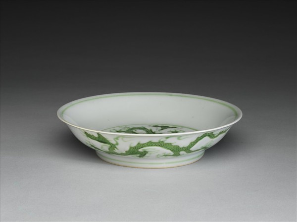 侈口,淺壁弧形,矮圈足。盤心與外壁刻畫雲龍三條,外壁隙地淺劃雙珠、波濤紋。薄胎白釉,龍紋加填綠彩,口足內外分畫綠線四道。底有青花書「大明正德年製」二行六字楷款,外加雙圈。