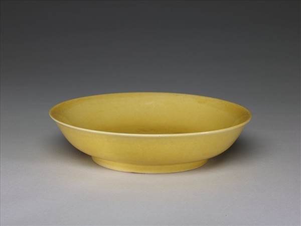 侈口,淺壁弧形,矮圈足。胎質稍厚,器內外壁滿施嬌黃釉,盤底純白,樸素無紋飾。底有青花書「大明正德年製」二行六字楷款,外加雙圈。