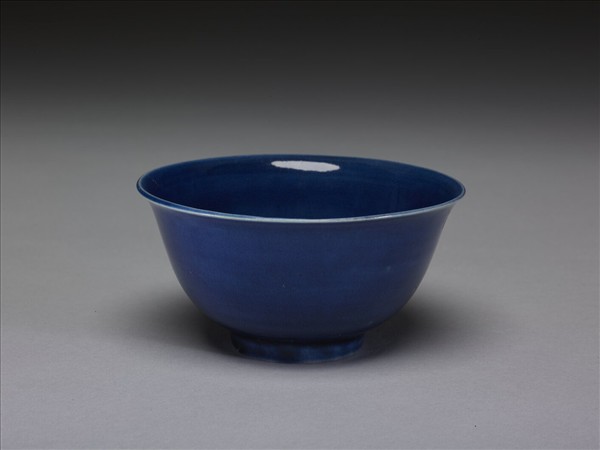 侈口窄唇,深壁,矮圈足。胎質稍薄,內外滿施霽青釉,樸素無紋飾。底有青花書「大明嘉靖年製」二行六字楷款,外加雙圈。