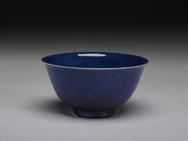侈口窄唇,深壁,矮圈足。胎質稍薄,內外滿施霽青釉,樸素無紋飾。底有青花書「大明嘉靖年製」二行六字楷款,外加雙圈。