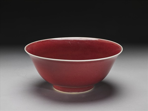 侈口,深弧壁,矮圈足。內外滿施深紅釉,釉色均勻,口沿留有一道白邊,圈足底緣露胎一圈,底有青花書「大明宣德年製」六字二行楷款,外加雙圈。