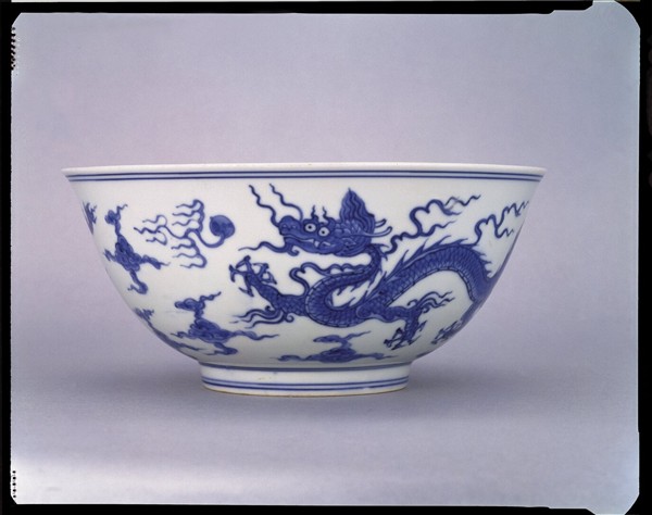 侈口窄唇,深壁,圈足。以釉下青花繪飾,盤外壁繪雙龍戲珠,間飾十字、三出雲紋。碗內素白無紋。口緣及圈足共飾青線六道。底青花書「大明成化年製」雙圈六字楷款。原貼有黃籤「頭等。成化明款此樣二件」。