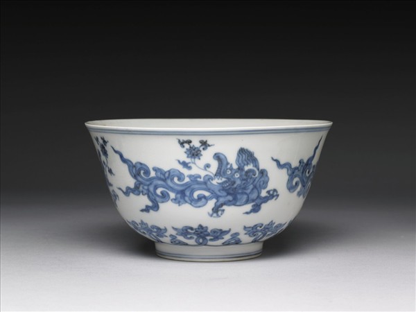 敞口碗,深直壁,圈足。以釉下青花繪飾。外壁青花繪四夔龍舌吐蓮花,底邊畫勾連圖案花一周,青料發色輕淡。內壁素白無紋,碗心一朵六出圖案花卉紋。口足各飾青線二道。底青花書「大明成化年製」雙方框六字楷款。原貼有黃簽︰「頭等成化明款此樣二件」。