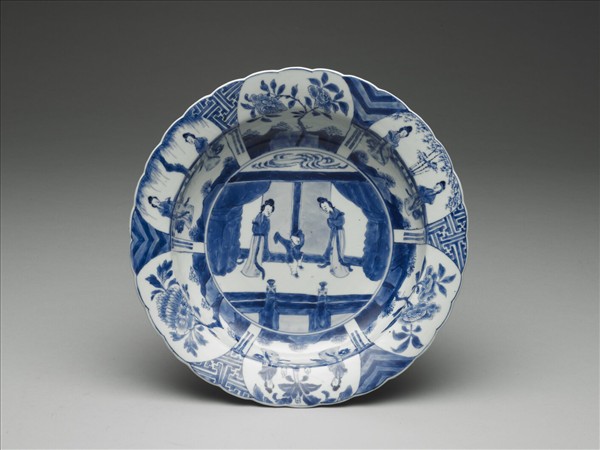 這件作品是十七世紀外銷荷蘭貿易瓷中的一種類型,倒扣之後很像當時流行的絨帽,因此讓荷蘭商人直接以帽子的名稱「klapmuts」稱呼這種器形的瓷器。整件作品有一道寬折沿花邊,從沿邊到器內弧形壁面的裝飾紋樣共分成六等份,三格畫庭園仕女小景,三格畫牡丹花叢,格子之間間飾卍字與尖角帶紋。反面折沿下畫六個帶雙向卷枝的朵花圖案,外周壁同樣分六格,內繪如意雲頭紋,底接矮圈足,足底緣無釉露胎,胎骨堅緻潔白,底面平坦無款識。造型之外,內外弧形壁面的分格作法,類似「卡拉克」瓷的風格,刻意拉長身軀比例的仕女正是十七世紀以來風靡歐洲市場的「修長伊莉莎白」樣貌,反映出皇室收藏中同時包含有貿易瓷的有趣面向。