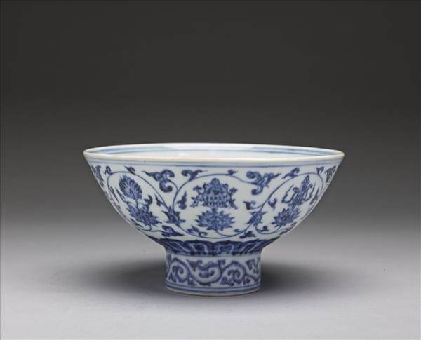 口微侈,深弧壁,圈足較一般高。外壁畫纏枝蓮托八吉祥紋,底邊蓮瓣紋一周,圈足上裝飾卷草紋,口、足間加飾淺線六道,內壁無紋。碗心款識為「大明宣德年製」六字一行楷書直款,外加長方雙框邊及雙圈。青花釉色濃艷,帶褐綠結晶斑,釉面氣泡晶亮。胎骨勻厚,質堅細膩。