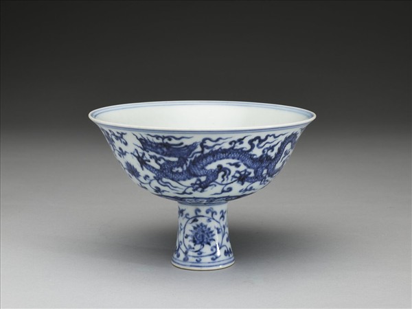 撇口,深弧壁,高足微侈,足中空。碗壁飾穿蓮雙龍,底邊為仰蓮瓣紋一周,高足畫纏枝三朵蓮,口足間加飾青線八道。青花釉色濃艷多處呈褐綠疵斑。胎骨勻厚,中空足底露胎,潔白細膩。碗心青花書「大明宣德年製」二行六字楷款,外加雙圈。
