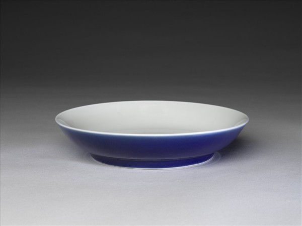 微侈口,淺壁弧形,矮圈足。胎質較薄,外壁施霽青釉,內壁、盤心及底純白,樸素無紋飾。底有青花書「大明成化年製」六楷字款,外加雙圈。