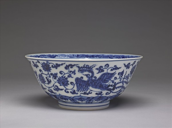 侈口窄唇,深壁,圈足。以釉下青花繪飾,外壁繪鳳凰一對,間飾纏枝番蓮花,底邊一圈變形蓮瓣紋。碗內口緣卷草紋一周,內壁飾暗花鳳凰紋,碗心畫雙鳳穿蓮。底青花書「大明成化年製」雙圈六字楷款。