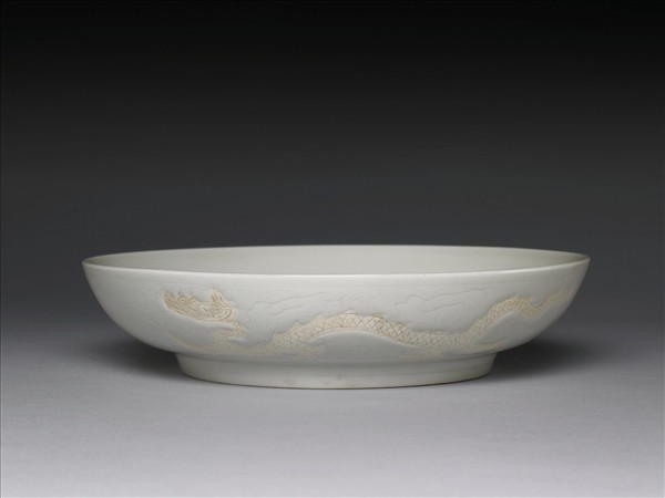 圓口碩腹,深弧壁,有圈足,器壁與器內均以陰線雕刻雲龍紋,其中器壁之上有龍兩隻,器內則僅有一隻,龍身略泛淺橘色,其餘則施罩白釉,整器便以甜白為基調。圈足內書有「大明弘治年製」六字楷款,款外以雙圈圍住。