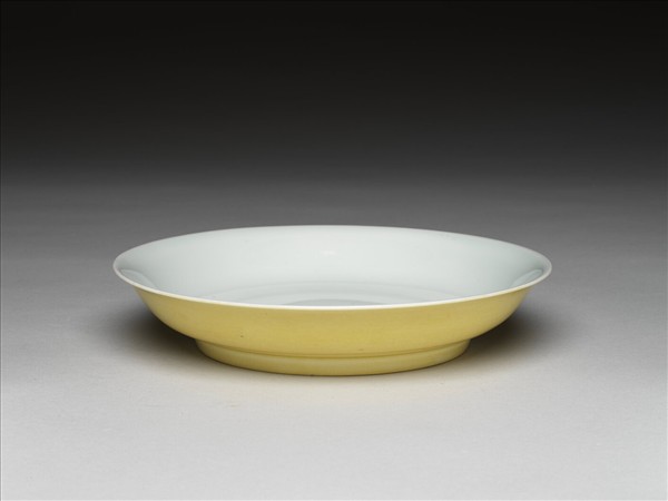 撇口窄唇,淺壁,矮圈足。胎骨勻薄,外壁均施嬌黃釉,盤裡及底純白。底青花書「大明成化年製」雙圈六字楷款。微有使用痕。