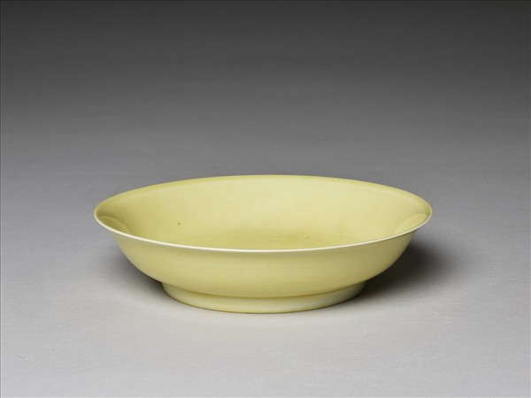 撇口窄唇,淺壁,矮圈足,胎薄。全器均施淡黃釉。底白釉上青花書「大明成化年製」雙圈六字楷款。款圈下方有後刻一「甜」字,盤內有使用痕。