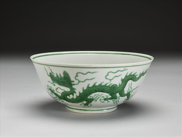 侈口窄唇,深壁,矮圈足。碗心與外壁刻畫雲龍三條,外壁隙地淺劃雙珠、波濤紋。內壁純白,樸素無紋飾,薄胎白釉,龍紋加填綠彩。底有青花書「大明弘治年製」二行六字楷款,外加雙圈。
