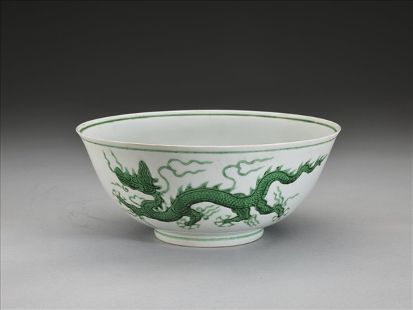 侈口窄唇,深壁,矮圈足。碗心與外壁刻畫雲龍三條,外壁隙地淺劃雙珠、波濤紋。內壁純白,樸素無紋飾,薄胎白釉,龍紋加填綠彩。底有青花書「大明弘治年製」二行六字楷款,外加雙圈。