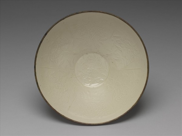 廣口小足,弧形深壁下收,圈足,口緣帶銅稜釦。內壁以印花為飾,六道細直稜凸線區劃器壁為六格空間,分飾不同的四季花卉,作寫生花叢的圖樣,花葉四展,滿佈格界中,各具姿態。碗心平凹陷,飾牡丹一枝。