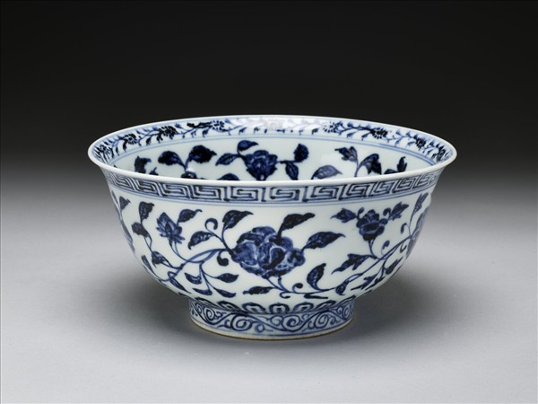 侈口窄唇,深壁,矮圈足。碗內口唇上畫轉枝菊花一周,內壁畫纏枝四季花五朵,碗心畫番蓮一枝。外面口沿下畫回紋一道,周壁畫纏枝四季花五朵,底邊畫蓮瓣紋,足圈畫卷草紋。內外花紋間加飾青線十一道。