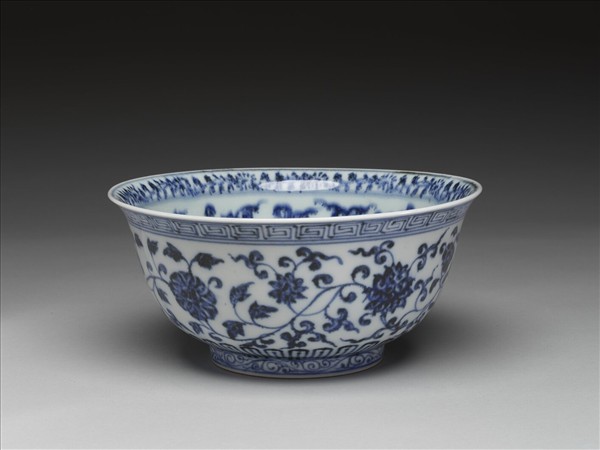 侈口窄唇,深壁,矮圈足。碗內口唇上畫轉枝菊花一周,內壁畫纏枝四季花五朵,碗心畫番蓮一枝。外面口沿下畫回紋一道,周壁畫纏枝四季花五朵,底邊畫蓮瓣紋,足圈畫卷草紋。內外花紋間加飾青線十一道。