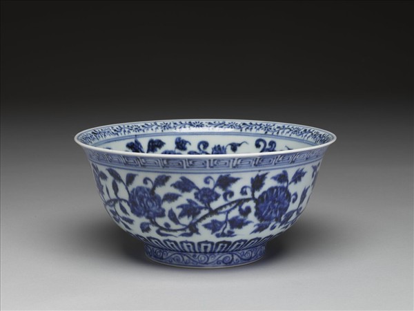 侈口窄唇,深壁,矮圈足。碗內口唇上畫轉枝菊花一周,內壁畫纏枝四季花五朵,碗心畫番蓮一枝。外面口沿下畫回紋一道,周壁畫纏枝四季花五朵,底邊畫蓮瓣紋,足圈畫卷草紋。內外花紋間加飾青線十一道。