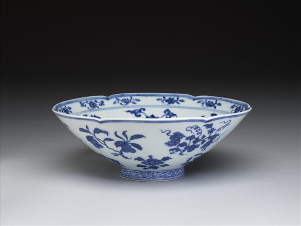 六瓣葵花形口,深壁,矮圈足。碗內口沿下兩道弦紋間畫各種花卉十二朵,內壁畫四季花卉六枝,底心三圈弦紋內畫桃實一枝。外壁口沿下弦紋兩道,器身畫折枝花、果分上下二層各六枝。足壁上下圈畫弦紋兩道,內飾卷草紋一周。底有青花書「大明宣德年製」六字二行楷款,外加雙圈。