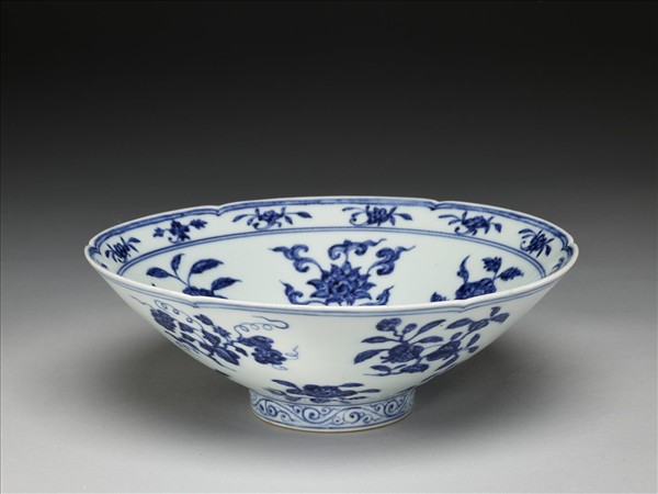 六瓣葵花形口,深壁,矮圈足。碗內口沿下兩道弦紋間畫各種花卉十二朵,內壁畫四季花卉六枝,底心三圈弦紋內畫桃實一枝。外壁口沿下弦紋兩道,器身畫折枝花、果分上下二層各六枝。足壁上下圈畫弦紋兩道,內飾卷草紋一周。底有青花書「大明宣德年製」六字二行楷款,外加雙圈。