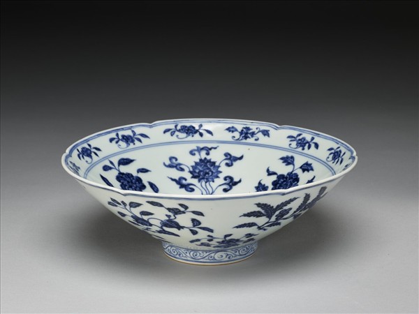 六瓣葵花形口,深壁,矮圈足。碗內口沿下兩道弦紋間畫各種花卉十二朵,內壁畫四季花卉六枝,底心三圈弦紋內畫桃實一枝。外壁口沿下弦紋兩道,器身畫折枝花、果分上下二層各六枝。足壁上下圈畫弦紋兩道,內飾卷草紋一周。底有青花書「大明宣德年製」六字二行楷款,外加雙圈。