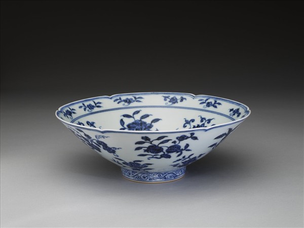 六瓣葵花形口,深壁,矮圈足。碗內口沿下兩道弦紋間畫各種花卉十二朵,內壁畫四季花卉六枝,底心三圈弦紋內畫桃實一枝。外壁口沿下弦紋兩道,器身畫折枝花、果分上下二層各六枝。足壁上下圈畫弦紋兩道,內飾卷草紋一周。底有青花書「大明宣德年製」六字二行楷款,外加雙圈。