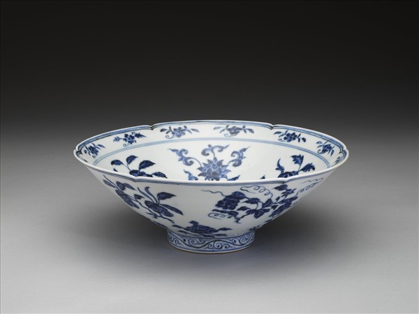 六瓣葵花形口,深壁,矮圈足。碗內口沿下兩道弦紋間畫各種花卉十二朵,內壁畫四季花卉六枝,底心三圈弦紋內畫桃實一枝。外壁口沿下弦紋兩道,器身畫折枝花、果分上下二層各六枝。足壁上下圈畫弦紋兩道,內飾卷草紋一周。底有青花書「大明宣德年製」六字二行楷款,外加雙圈。