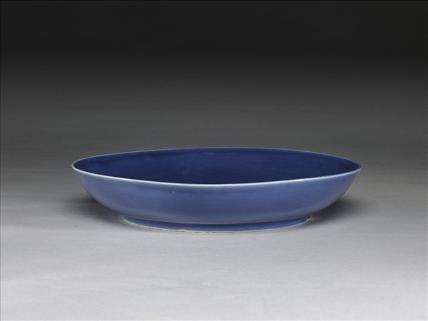 敞口窄唇,淺弧形壁,矮圈足。全器施霽青釉,施釉至足邊,口沿與足邊各留一道白邊,足緣無釉露白胎。足內壁及底施白釉,底有「大明萬曆年製」六字二行楷體暗款,外加雙圈。