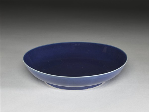 敞口窄唇,淺弧形壁,矮圈足。全器施霽青釉,施釉至足邊,口沿與足邊各留一道白邊,足緣無釉露白胎。足內壁及底施白釉,底有「大明萬曆年製」六字二行楷體暗款,外加雙圈。