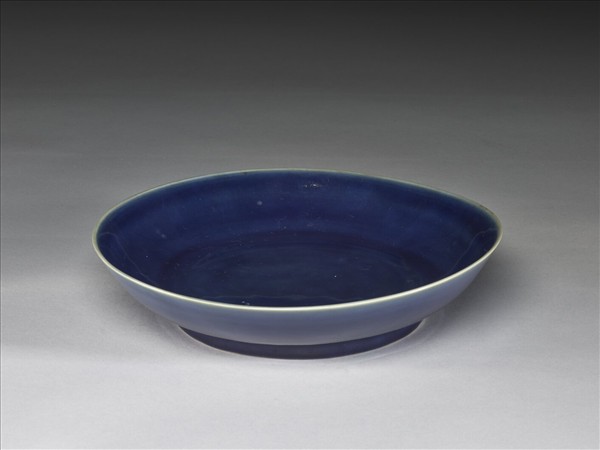 敞口窄唇,淺弧形壁,矮圈足。全器施霽青釉,施釉至足邊,口沿與足邊各留一道白邊,足緣無釉露白胎。足內壁及底施白釉,底有「大明萬曆年製」六字二行楷體暗款,外加雙圈。