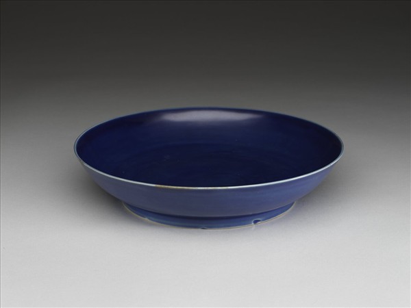 敞口窄唇,淺弧形壁,矮圈足。全器施霽青釉,施釉至足邊,口沿與足邊各留一道白邊,足緣無釉露白胎。足內壁及底施白釉,底有「大明萬曆年製」六字二行楷體暗款,外加雙圈。
