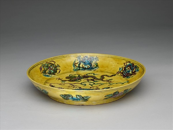 三彩黃地花果龍紋盤