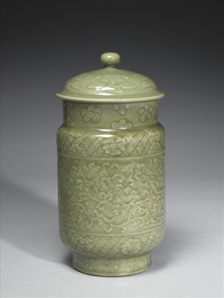 罐,直口、圓唇稜、短直頸、筒形長腹,圈足。頸與足壁飾五瓣形朵花紋,腹上下緣各為卍字方格錦綴以朵花紋;腹身則雕拱纏枝番蓮紋。全器胎體厚重,釉色豆青而透亮;足滿釉,而底部有環形圈墊痕,無釉色呈火紅。帶穹頂平沿蓋,寶珠頂,蓋面飾五折枝花朵,釉色較灰淡,雕痕平淺,疑非原配件。壯罐,是一種可能受到西亞藥罐形制影響的器皿,器身也往往作多方斜格或伊斯蘭式紋飾。永宣時雖有壯罐形制出現,此器卍字錦地花紋布置看來,或應為明中期物。
