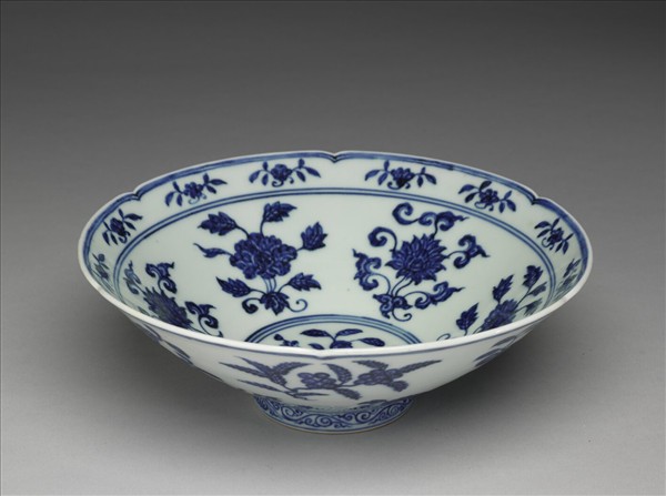 碗,六瓣葵花形口,深壁,矮圈足。碗內口沿下兩道弦紋間畫各種花卉十二朵,內壁畫四季花卉六枝,底心三圈弦紋內畫桃實一枝。外壁口沿下弦紋兩道,器身畫折枝花、果分上下二層各六枝。足壁上下圈畫弦紋兩道,內飾勾雲紋一週。器外底青花雙圈書「大明宣德年製」兩行楷款。