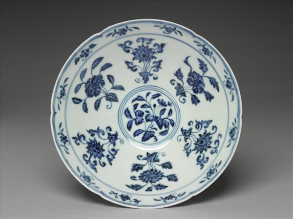 碗,六瓣葵花形口,深壁,矮圈足。碗內口沿下兩道弦紋間畫各種花卉十二朵,內壁畫四季花卉六枝,底心三圈弦紋內畫桃實一枝。外壁口沿下弦紋兩道,器身畫折枝花、果分上下二層各六枝。足壁上下圈畫弦紋兩道,內飾勾雲紋一週。器外底青花雙圈書「大明宣德年製」兩行楷款。