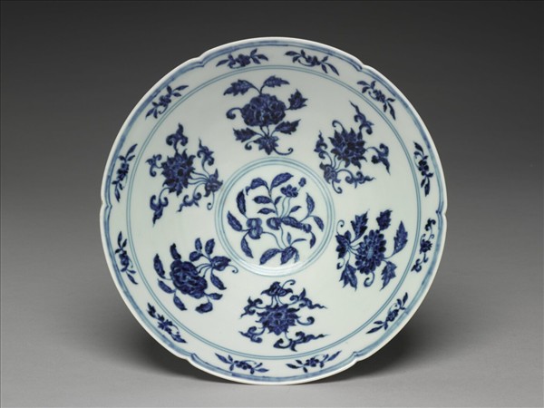 碗,六瓣葵花形口,深壁,矮圈足。碗內口沿下兩道弦紋間畫各種花卉十二朵,內壁畫四季花卉六枝,底心三圈弦紋內畫桃實一枝。外壁口沿下弦紋兩道,器身畫折枝花、果分上下二層各六枝。足壁上下圈畫弦紋兩道,內飾勾雲紋一週。器外底青花雙圈書「大明宣德年製」兩行楷款。