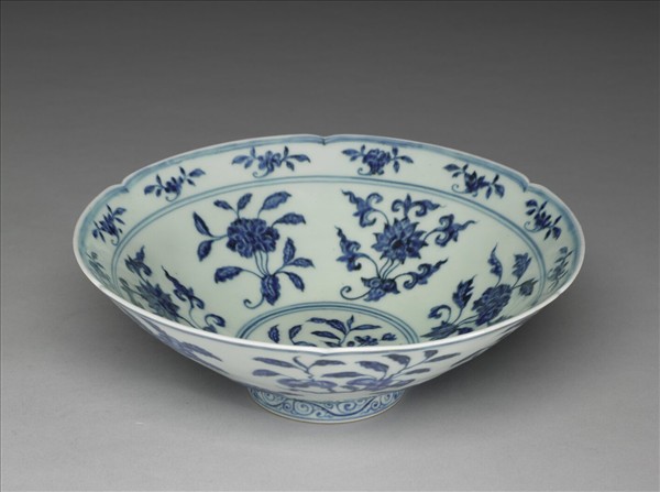 碗,六瓣葵花形口,深壁,矮圈足。碗內口沿下兩道弦紋間畫各種花卉十二朵,內壁畫四季花卉六枝,底心三圈弦紋內畫桃實一枝。外壁口沿下弦紋兩道,器身畫折枝花、果分上下二層各六枝。足壁上下圈畫弦紋兩道,內飾勾雲紋一週。器外底青花雙圈書「大明宣德年製」兩行楷款。