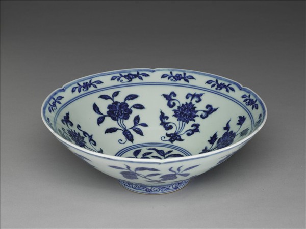 碗,六瓣葵花形口,深壁,矮圈足。碗內口沿下兩道弦紋間畫各種花卉十二朵,內壁畫四季花卉六枝,底心三圈弦紋內畫桃實一枝。外壁口沿下弦紋兩道,器身畫折枝花、果分上下二層各六枝。足壁上下圈畫弦紋兩道,內飾勾雲紋一週。器外底青花雙圈書「大明宣德年製」兩行楷款。