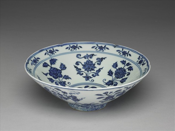 碗,六瓣葵花形口,深壁,矮圈足。碗內口沿下兩道弦紋間畫各種花卉十二朵,內壁畫四季花卉六枝,底心三圈弦紋內畫桃實一枝。外壁口沿下弦紋兩道,器身畫折枝花、果分上下二層各六枝。足壁上下圈畫弦紋兩道,內飾勾雲紋一週。器外底青花雙圈書「大明宣德年製」兩行楷款。