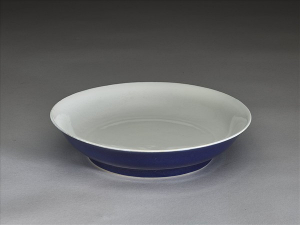 侈口,淺壁弧形,矮圈足。胎質稍厚,外壁施霽青釉,內壁錐拱雙龍紋,模糊不清。盤心及底純白,樸素無紋飾。底有「大明宣德年製」六字二行楷體暗款,外加雙圈。