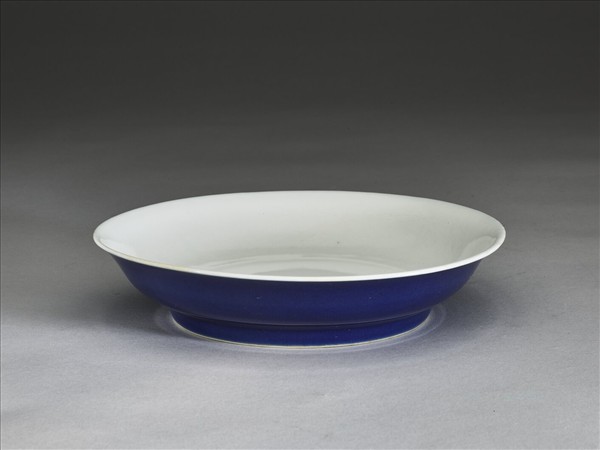 侈口,淺壁弧形,矮圈足。胎質稍厚,外壁施霽青釉,內壁錐拱雙龍紋,模糊不清。盤心及底純白,樸素無紋飾。底有「大明宣德年製」六字二行楷體暗款,外加雙圈。