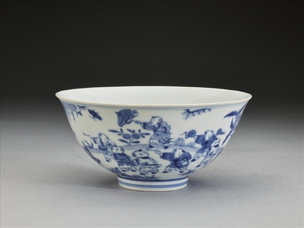 侈口窄唇,深壁,矮圈足。碗內樸素無紋飾,碗外壁繪夏日庭院嬰戲圖,襯以圍欄、樹石、花卉、雲層。十五孩童分隔成二組畫面,一組穿肚兜赤膊,一組穿衫褲。孩童頭部只以青料線勾繪無渲染。口足加飾青線六道。底有青花書「大明成化年製」六字二行楷款,外加雙圈。
